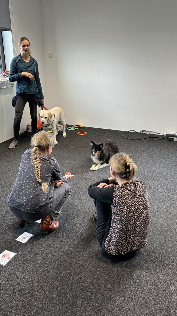 Mercredi 29 octobre, le Centre Lyonnais des Émotions et Apprentissages a accueilli une activité pas comme les autres : un atelier de médiation animale dédié aux compétences sociales. Aux commandes, Isabelle Berthonneau, de Médiation Animale Lyon, accompagnée de deux partenaires à quatre pattes : Pataouète, un labrador au regard doux, et Muffin, un colley de petite taille, tous deux rompus au travail auprès des enfants.