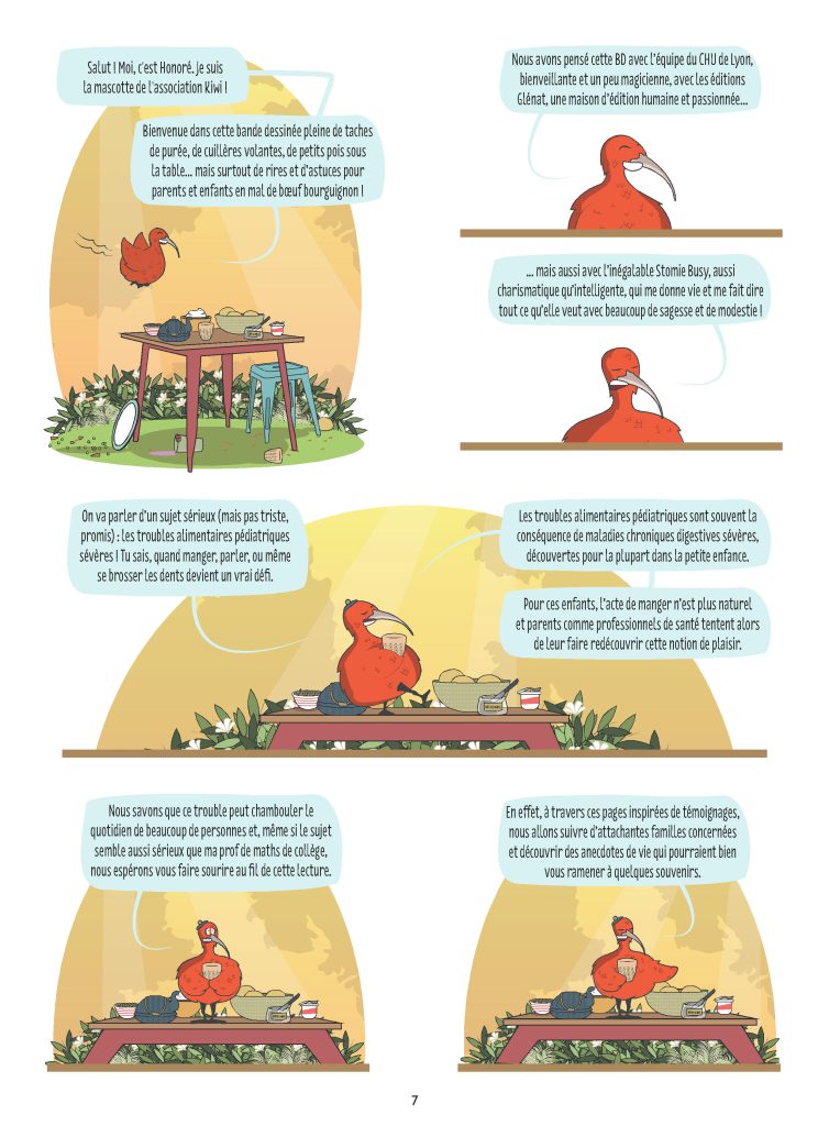 Pensé avec les Hospices Civils de Lyon et les éditions Glénat, cet album solaire de l’artiste Stomie Busy sensibilise les professionnels, apporte un soutien aux familles et reste une belle invitation à voir l’alimentation autrement. Avec humour, poésie et une bonne dose de bienveillance, la bande dessinée aborde sans fard un sujet complexe et encore peu connu à l’aide d’un ton décalé tendre et pédagogue. À lire et à partager. Parce que manger, c’est aussi une histoire de cœur.