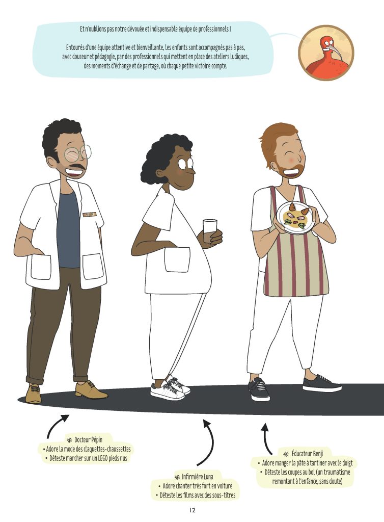 Genèse de l’histoire de notre bande-dessinée. Le projet a commencé à émerger dans nos têtes en 2019. Il s’agissait alors de trouver le bon outil. Après plusieurs réunions et de nombreux échanges, l’idée s’est imposée : créer une bande dessinée à destination des familles. L’objectif était de proposer un outil simple, ludique et bienveillant, permettant de dédramatiser les troubles de l’oralité. Plus le parent se détend, plus il s’autorise à regarder son enfant sous un angle différent, avec davantage de compréhension et de sérénité. Puis la COVID est passée par là. Le projet a stagné. Comme beaucoup, nous avons traversé une période de découragement. Mais nous avons repris, pas à pas : recherche de financements, rencontres avec les bons partenaires et beaucoup de travail. Aujourd’hui, cette bande dessinée est devenue réalité. Nous sommes tous fiers et heureux du chemin parcouru.