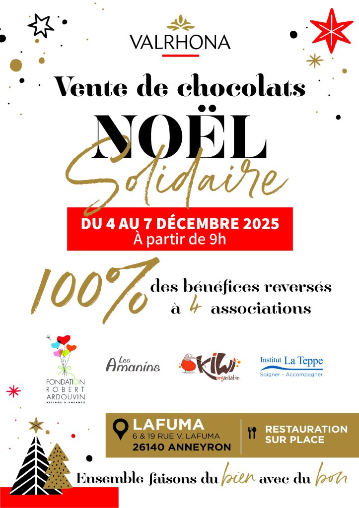 Cette année, la solidarité aura un goût de chocolat. Kiwi Organisation fait partie des quatre associations sélectionnées pour bénéficier du Noël solidaire de Valrhona, aux côtés des Amanins, de l’Institut La Teppe et de la Fondation Ardouvin. Un rendez-vous gourmand et engagé qui se tiendra du 4 au 7 décembre lors de la Grande Braderie organisée au village de marque Lafuma, à Anneyron (26140).